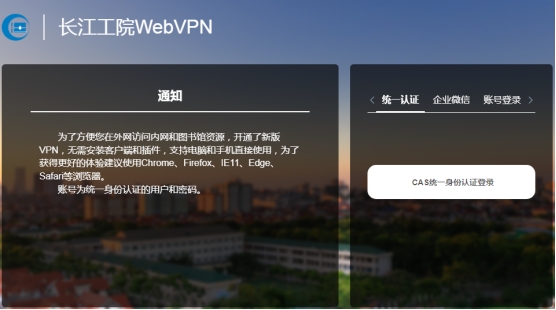 2.进入学校主页,点击主页顶部“校网VPN”,打开“长江工院WEBVPN”,通过“统一认证、企业微信扫码或账号登录”进入,可使用中国知网、起点考试网(可注册校园网IP范围内的个人账号)、汇雅电子图书等。